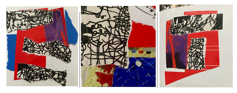 "Structured Dissonance":Triptych in Red, Black, and Blue, Paper and acrylic collage